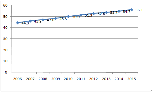 我國(guó)的城鎮(zhèn)化率在不斷提高,“十二五”期間,我國(guó)城鎮(zhèn)化進(jìn)程穩(wěn)步推進(jìn),城鎮(zhèn)化率顯著提升,年均提高 1.23 個(gè)百分點(diǎn),每年城鎮(zhèn)人口增加 2000 萬(wàn),到 2015 年,我國(guó)的城鎮(zhèn)化率已經(jīng)提高至 56.1%,城鎮(zhèn)常住人口為 7.71 億。盡管如此,我國(guó)城鎮(zhèn)化率還是遠(yuǎn)低于發(fā)達(dá)國(guó)家 80%的平均水平,也低于人均收入與我國(guó)相近的發(fā)展中國(guó)家 60%的平均水平,還有較大的發(fā)展空間。