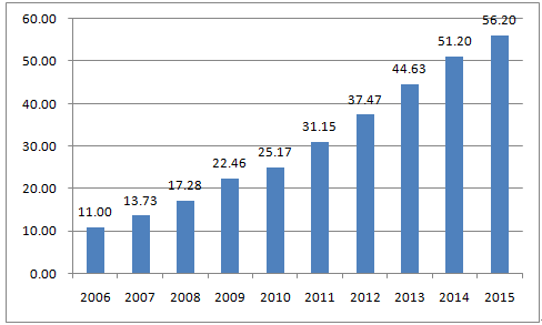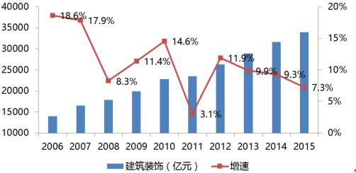 從歷年建筑裝飾產(chǎn)值與全國(guó) GDP 比重上看,該比重基本在 5%上下浮動(dòng),近幾年呈小幅上升變動(dòng)。自 2006 年至 2015 年,全國(guó)建筑裝飾行業(yè)工程總產(chǎn)值由 1.4 萬(wàn)億增長(zhǎng)至 3.4 萬(wàn)億元,年均復(fù)合增長(zhǎng)率為 10.36%。盡管自 2012 年開(kāi)始,行業(yè)工程總產(chǎn)值同比增長(zhǎng)率逐漸下滑,但總體仍保持著穩(wěn)健的發(fā)展態(tài)勢(shì)。