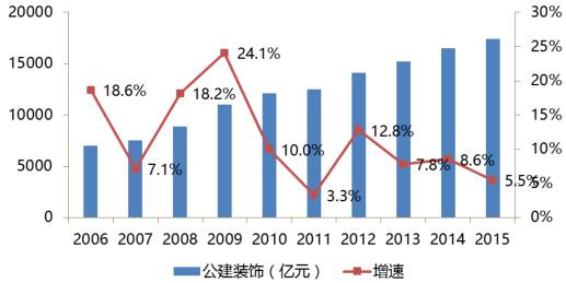 2006 年至 2015 年全社會(huì)固定資產(chǎn)投資完成額近20%的年復(fù)合增長(zhǎng)率將在未來(lái)十年內(nèi)體現(xiàn)在公共裝飾存量市場(chǎng)改造的市場(chǎng)增速上,帶來(lái)存量改造市場(chǎng)的黃金發(fā)展期。