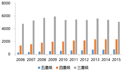 高端星級(jí)酒店存量改造市場(chǎng)年均增速料將超過(guò) 10%。隨著國(guó)內(nèi)商務(wù)活動(dòng)的逐漸增多和旅游的興起,國(guó)內(nèi)星級(jí)酒店得到了快速發(fā)展。截止到 2015 年,全國(guó)星級(jí)飯店統(tǒng)計(jì)管理系統(tǒng)中共有 12327 家星級(jí)飯店,其中五星級(jí) 789 家,四星級(jí) 2375 家,三星級(jí) 5098 家。2006-2015 年度,全國(guó)五星級(jí)、四星級(jí)、三星級(jí)酒店數(shù)量的年均增長(zhǎng)率為 11.26%、6.31%、0.72%,呈現(xiàn)出較平穩(wěn)的發(fā)展態(tài)勢(shì)。未來(lái)幾年,十年內(nèi)新開(kāi)業(yè)的高端星級(jí)酒店,特別是五星、四星酒店將迎來(lái)重新裝飾改造的高峰。