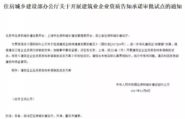 按照地方自愿原則,確定以建設(shè)工程企業(yè)較多、市場(chǎng)監(jiān)管水平較高、電子化資質(zhì)審批成效明顯的北京市、上海市、浙江省作為試點(diǎn)地區(qū),對(duì)工商注冊(cè)地為試點(diǎn)地區(qū)的建筑工程、市政公用工程施工總承包一級(jí)資質(zhì)開展告知承諾審批試點(diǎn)。