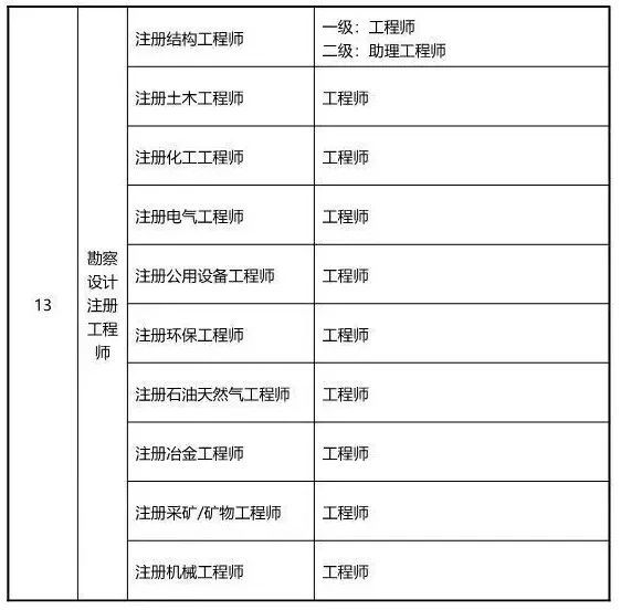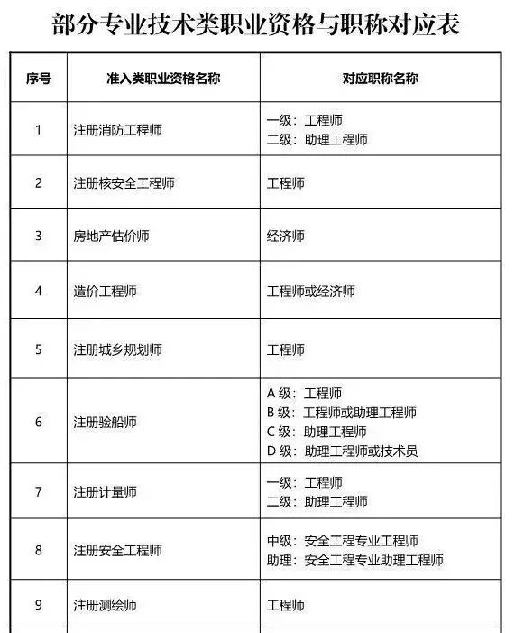 一、通過全國統(tǒng)一考試,取得注冊消防工程師、注冊核安全工程師、房地產(chǎn)估價師、造價工程師、注冊城鄉(xiāng)規(guī)劃師、注冊驗船師、注冊計量師、注冊安全工程師、注冊測繪師、注冊會計師、注冊建筑師、建造師、勘察設(shè)計注冊工程師等13項準入類職業(yè)資格證書的專業(yè)技術(shù)人員,其職業(yè)資格直接對應(yīng)相應(yīng)系列和層級的職稱(見附件),兩者享有同等效力。