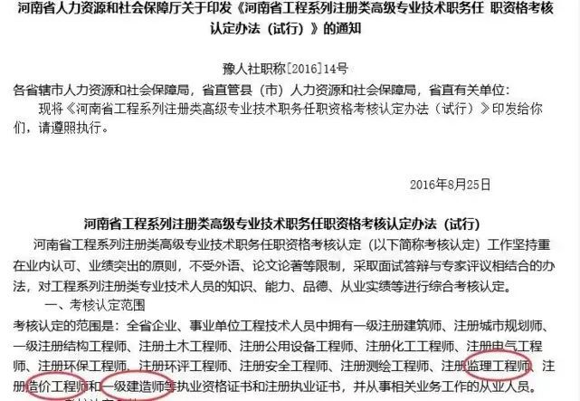 2016年,《河南省工程系列注冊類高級專業(yè)技術(shù)職務(wù)任職資格考核認定辦法(試行)》明確: