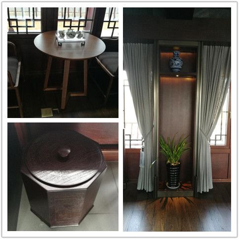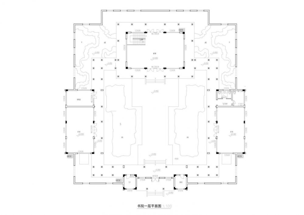 整個項(xiàng)目由典型的中式合院結(jié)構(gòu)圍合而成:由三幢主要的仿古建筑、加上接待室、值班室、圍廊等建筑物構(gòu)成,另設(shè)有牌樓、雕塑等外圍景觀小品,建筑物占地面積1480平米,建筑面積約750平米。接到案子后,設(shè)計(jì)小組經(jīng)過反復(fù)討論,對原建筑設(shè)計(jì)做了局部調(diào)整優(yōu)化:左廂房(陽明陳列館)的門窗做了局部調(diào)整,藏書樓的樓梯移位、門窗;琴房的公衛(wèi)位置等進(jìn)行了平面調(diào)整;室外景觀方面,由于考慮人流可能會較多,原中庭院的四個水景取消改為青石滿鋪,加地埋燈,增加泰山石造型及中間涌泉造型景觀;在入口增加玄關(guān)墻,把中式庭院景觀對于“隱與透”在書院的入口做一些“猶抱琵琶半遮面”的細(xì)部處理。