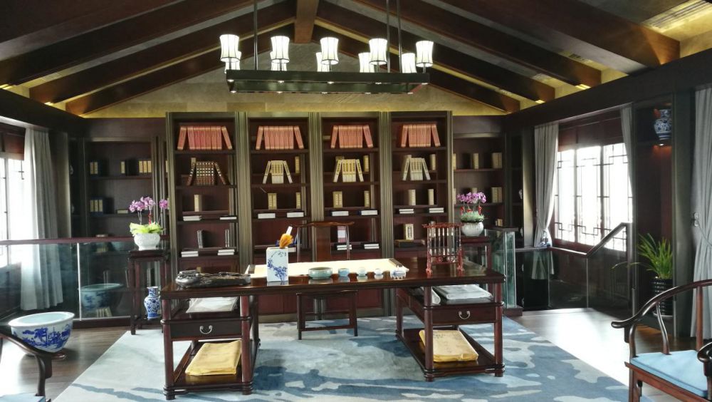 藏書樓接待區(qū):配設(shè)明式圈椅,黛青色山水紋羊毛毯儀式感莊重、氛圍典雅。