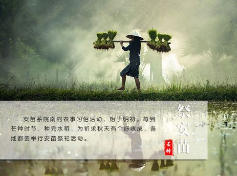安苗系皖南的農(nóng)事習(xí)俗活動,始于明初。每到芒種時節(jié),種完水稻,為祈求秋天有個好收成,各地都要舉行安苗祭祀活動。家家戶戶用新麥面蒸發(fā)包,把面捏成五谷六畜、瓜果蔬菜等形狀,然后用蔬菜汁染上顏色,作為祭祀供品,祈求五谷豐登、村民平安。