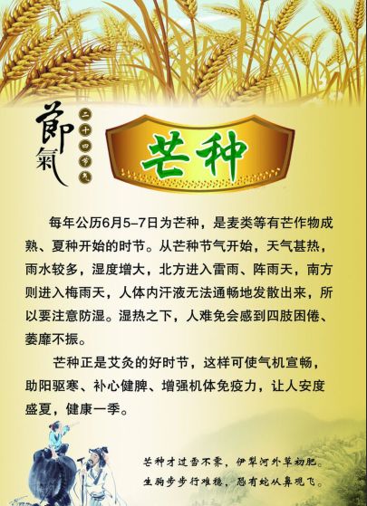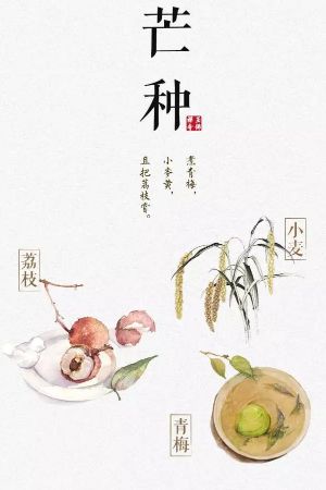 芒種是二十四節(jié)氣中的第9個節(jié)氣,更是干支歷午月的起始;時間點(diǎn)在公歷每年6月6日前后,太陽到達(dá)黃經(jīng)75°時。芒種字面的意思是"有芒的麥子快收,有芒的稻子可種"。中國古代將芒種分為三候:“一候螳螂生;二候鵬始鳴;三候反舌無聲。”此時中國長江中下游地區(qū)將進(jìn)入多雨的黃梅時節(jié)。