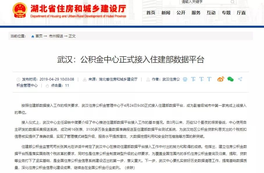 4月29日,湖北省住建廳官網(wǎng)發(fā)布了武漢住房公積金管理中心正式接入住建部數(shù)據(jù)平臺(tái)的新聞。武漢住房公積金管理中心于4月24日上午9:00正式接入住建部數(shù)據(jù)平臺(tái)。