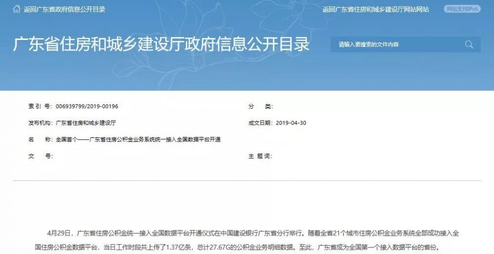 4月30日,廣東省住建廳官網(wǎng)發(fā)布了該省住房公積金業(yè)務(wù)系統(tǒng)統(tǒng)一接入全國數(shù)據(jù)平臺(tái)開通的新聞。廣東省成為全國第一個(gè)接入數(shù)據(jù)平臺(tái)的省份。