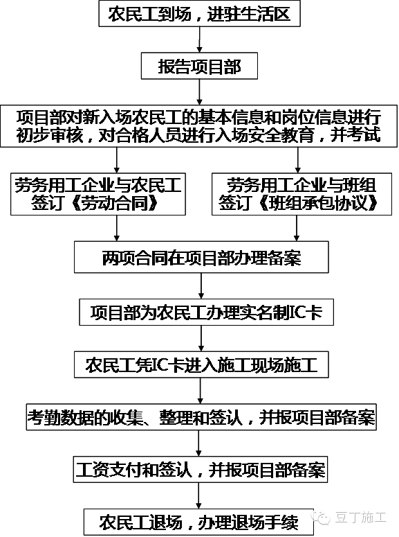 一、做好農(nóng)民工進場施工前的各項手續(xù)1、如何做到勞務分包隊伍自覺向項目部申報施工人員進場情況的關鍵是:現(xiàn)場封閉管理——沒有按規(guī)定辦理手續(xù)堅決不能進入施工現(xiàn)場。2、七天內辦理好以下相關手續(xù),考慮到現(xiàn)場施工和減少作業(yè)人員等待時間的需要,可以優(yōu)先上報花名冊和辦理IC卡,但其他手續(xù)辦理完成以7天為管理底線。3、《勞動合同》是國家《勞動合同法》明文規(guī)定要簽訂的,但建筑行業(yè)農(nóng)民工群體執(zhí)行普遍不好,但涉及到勞務糾紛時,政府是依照《勞動合同》辦理。《班組承包協(xié)議》不同于集體合同,是民間行為,目前階段以及政府為了維穩(wěn),該協(xié)議是不受法律保護的,但大部分老板與作業(yè)人員在建立相互信任、協(xié)商的基礎上,基本上都是按照班組承包協(xié)議辦理結算。4、安全入場教育及考試等也是《勞動合同法》中要求施工企業(yè)做到的 。