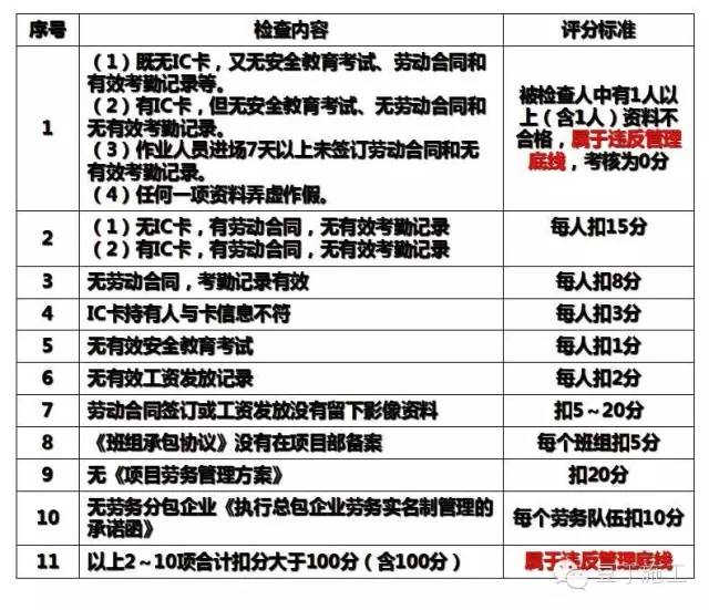 實名制管理工作的目的: 1、監(jiān)督進場人員身份“合法”、有效,并履行教育培訓的義務。2、監(jiān)督《勞動合同》、《班組承包協(xié)議》簽訂有效,并100%覆蓋。3、考勤記錄有效。4、監(jiān)督工資發(fā)放。只要做到以上第1、2、3條,即可對潛在的有風險的勞務隊伍、班組、個人起到威懾作用,將減少勞務糾紛的發(fā)生。因此,公司在考核實名制管理時,主要檢查過程資料的有效性(考勤方式可根據(jù)各分公司實際,自己確定,盡可能采用電子信息化手段),而不以勞務糾紛的發(fā)生率作為考核依據(jù)。一、考核、評價1、檢查頻次項目經(jīng)理部每周進行一次勞務實名制管理檢查;分公司每月至少進行一次勞務實名制管理檢查;公司勞務管理中心進行季度檢查以及不定期抽查。2、檢查方式現(xiàn)場隨機抽查10名以上勞務作業(yè)人員,筆錄其姓名、隊別、班組、工種等信息,然后根據(jù)現(xiàn)場筆錄信息,檢查被抽查人員在勞務管理資料庫中的其他所有信息和資料。3、評分標準勞務實名制管理考核評價滿分為100分,不符合下表中的檢查內容,則按下表評分標準從100分中扣除,扣完為止。