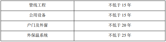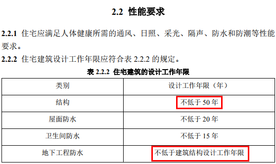 結(jié)構(gòu)不低于50年,屋面防水不低于20年,衛(wèi)生間防水不低于15年,地下工程防水不低于結(jié)構(gòu)設(shè)計(jì)工作年限(即50年)。