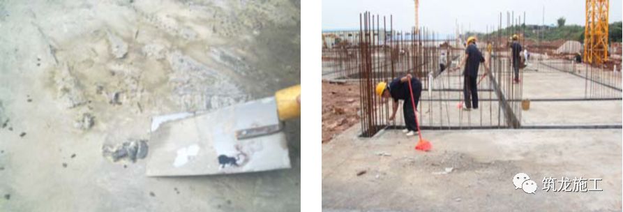 用鐵鏟、掃帚等工具清除基層表面上的浮漿、凸起物、施工垃圾等,排除明水。基層表面應(yīng)平整、凹處用水泥砂漿抹平,無(wú)尖銳突起物。