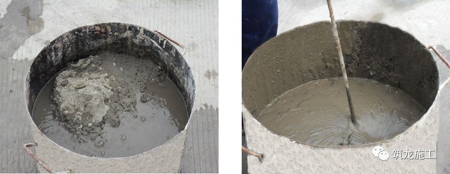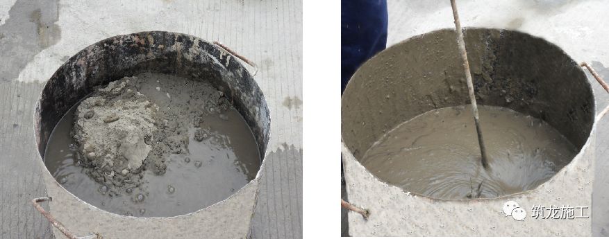 水:水泥=1:2(重量比)。先按比例將水倒入原已備好的拌漿桶,再將水泥徐徐放入水中,浸泡15~20分鐘并充分浸透后,無(wú)冒氣泡現(xiàn)象了,把桶面多余的水倒掉;(溫度高時(shí)加入水泥用量的5%~8%聚合物建筑膠(保水劑)),用電動(dòng)攪拌機(jī)進(jìn)行攪拌,攪拌時(shí)間5分鐘。