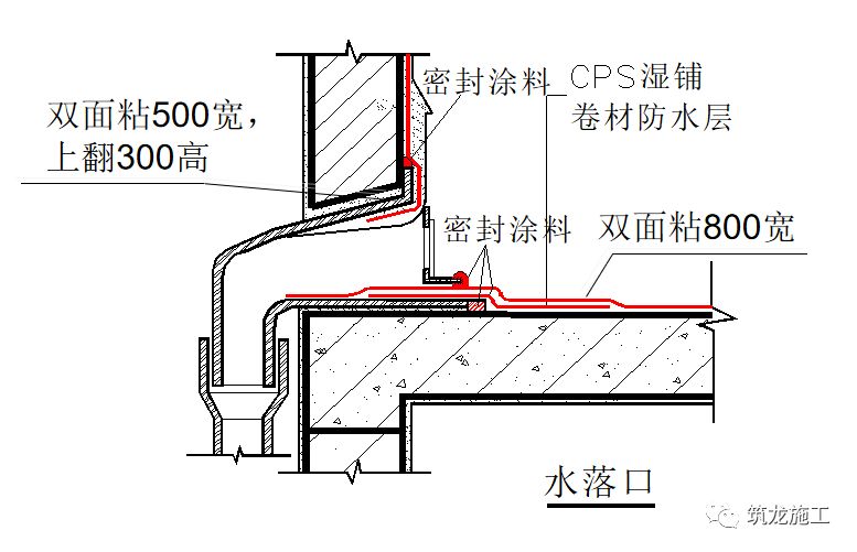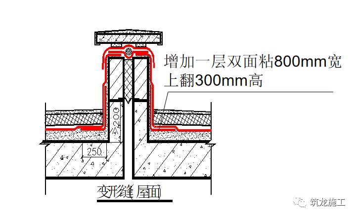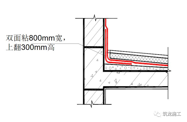 5)卷材沿立面墻,上翻300高,此位置用寬度為800MM的雙面粘折成直角鋪貼,水平面的反應(yīng)粘壓住雙面粘。