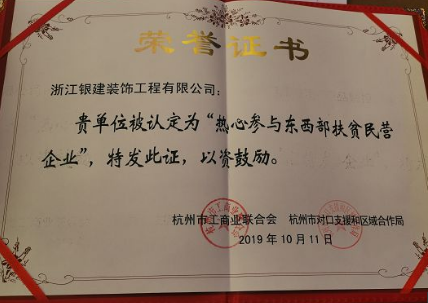 我司董事長葉友希先生帶領(lǐng)浙江銀建裝飾工程有限公司也積極響應(yīng)打贏脫貧攻堅戰(zhàn)的號召,捐款20萬為扶貧攻堅事業(yè)添磚加瓦。我司在自身健康發(fā)展的同時,牢記習(xí)近平總書記扶貧開發(fā)工作系列重要講話精神,始終不忘以實際行動回饋社會,踐行社會責(zé)任。