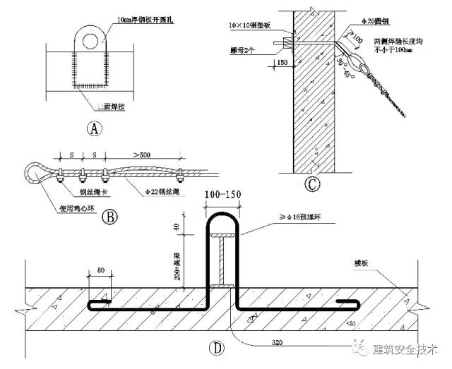 (2)當(dāng)采用鋼筋拉環(huán)錨固時,拉環(huán)應(yīng)錨入樓板30d,并壓在樓板下層鋼筋下面,如不能保證鋼筋的混凝土保護層厚度,也可以將拉環(huán)壓在樓板下層鋼筋上面,同時在拉環(huán)上部兩側(cè)各附加兩根直徑14-16mm的鋼筋,并與樓板鋼筋綁扎牢固,以確保拉環(huán)不會從混凝土樓板中拔出