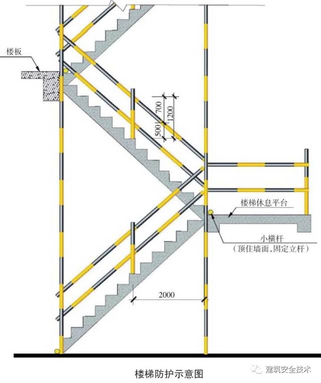 ( 1)樓梯及休息平臺臨邊處無可靠防護時應(yīng)設(shè)置防護欄桿。應(yīng)在1.2m、0.6m高處及底部設(shè)置三道防護欄桿,桿件內(nèi)側(cè)掛密目式安全立網(wǎng)