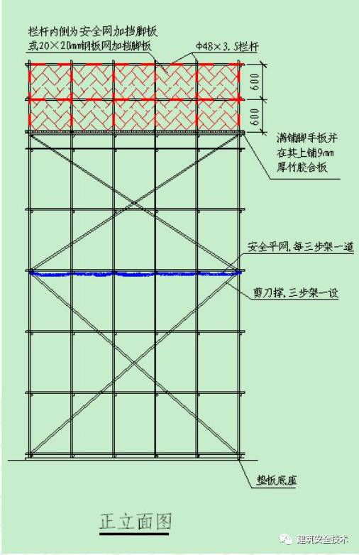 (2)腳手架外側(cè)自第二步起底部設(shè)180mm擋腳板,在高600mm與1200mm處各設(shè)同材質(zhì)的防護欄桿一道。腳手架內(nèi)側(cè)形成臨邊的,則按腳手架外側(cè)防護做法。