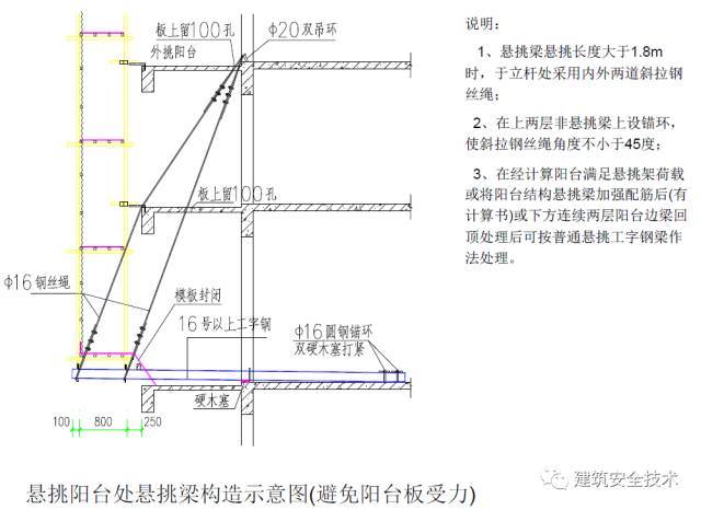 (3)懸挑梁錨環(huán)端應(yīng)設(shè)置兩道錨環(huán)(間距20cm),錨環(huán)直徑16mm以上。每道鋼梁端部設(shè)置φ14mm以上斜拉鋼絲繩,上端吊環(huán)使用φ20mm圓鋼預(yù)埋。
