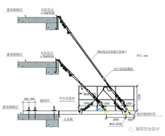 (4)鋼絲繩直徑應(yīng)根據(jù)計算確定且不小于ø21.5,平臺兩邊各設(shè)前后兩道獨立斜拉鋼絲繩,分別拉接在4個拉結(jié)點上,斜拉鋼絲繩與平臺間夾角應(yīng)大于45°,繩卡數(shù)量、間距按照規(guī)范設(shè)置。