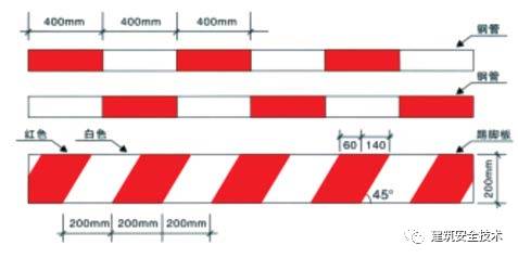 (4)紅白相間雙色油漆:剪刀撐、橫向斜撐、踢腳板、樓梯臨邊防護欄桿、施工電梯卸料平臺臨邊防護欄桿。