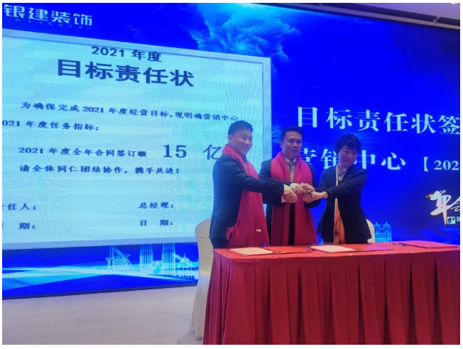 營銷副總洪偉慧、營銷總監(jiān)李祖菊共同簽署“營銷中心2021年目標責任狀”