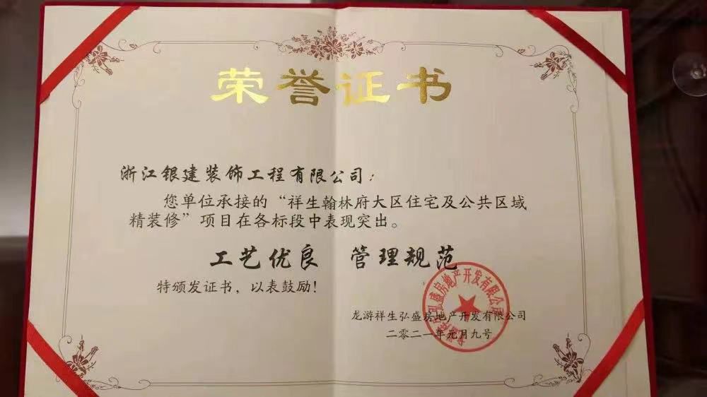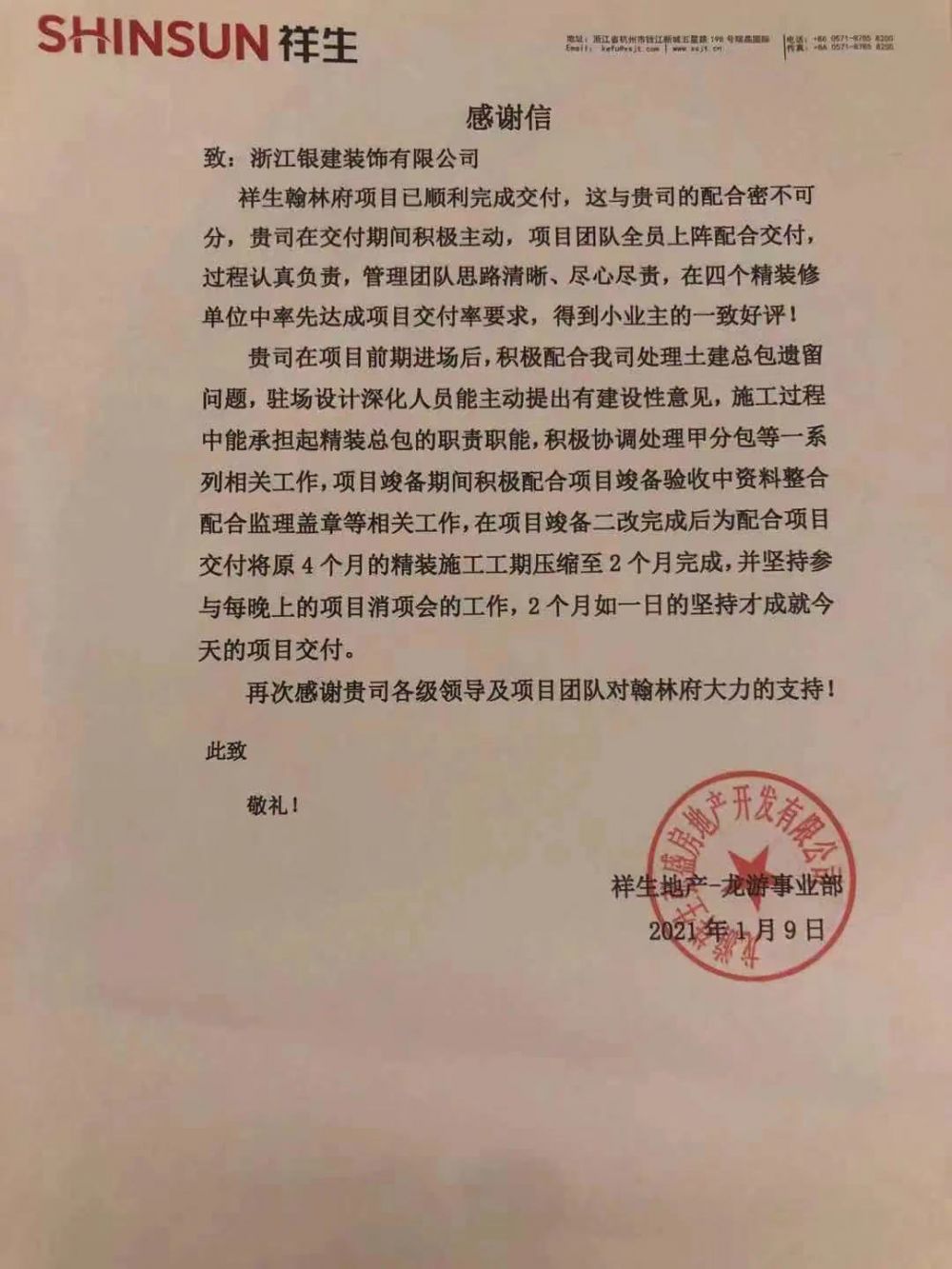 2021年1月19日,我司承接的“龍游祥生翰林府大區(qū)住宅及公共區(qū)域精裝修 ”項目收到由龍游祥生弘盛房地產(chǎn)有限公司送來的“施工優(yōu)良 管理規(guī)范”鮮艷錦旗、榮譽證書和感謝信。以感謝“龍游祥生翰林府大區(qū)住宅及公共區(qū)域精裝修”項目部工作人員在項目中優(yōu)質施工、盡心盡責的服務!